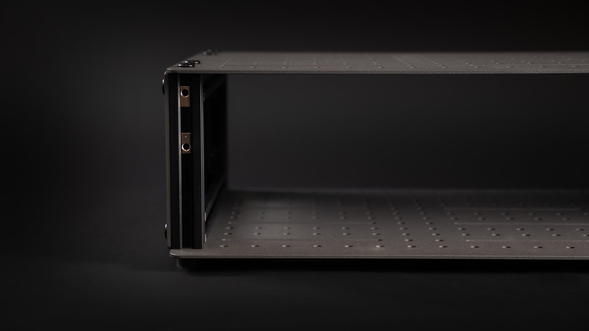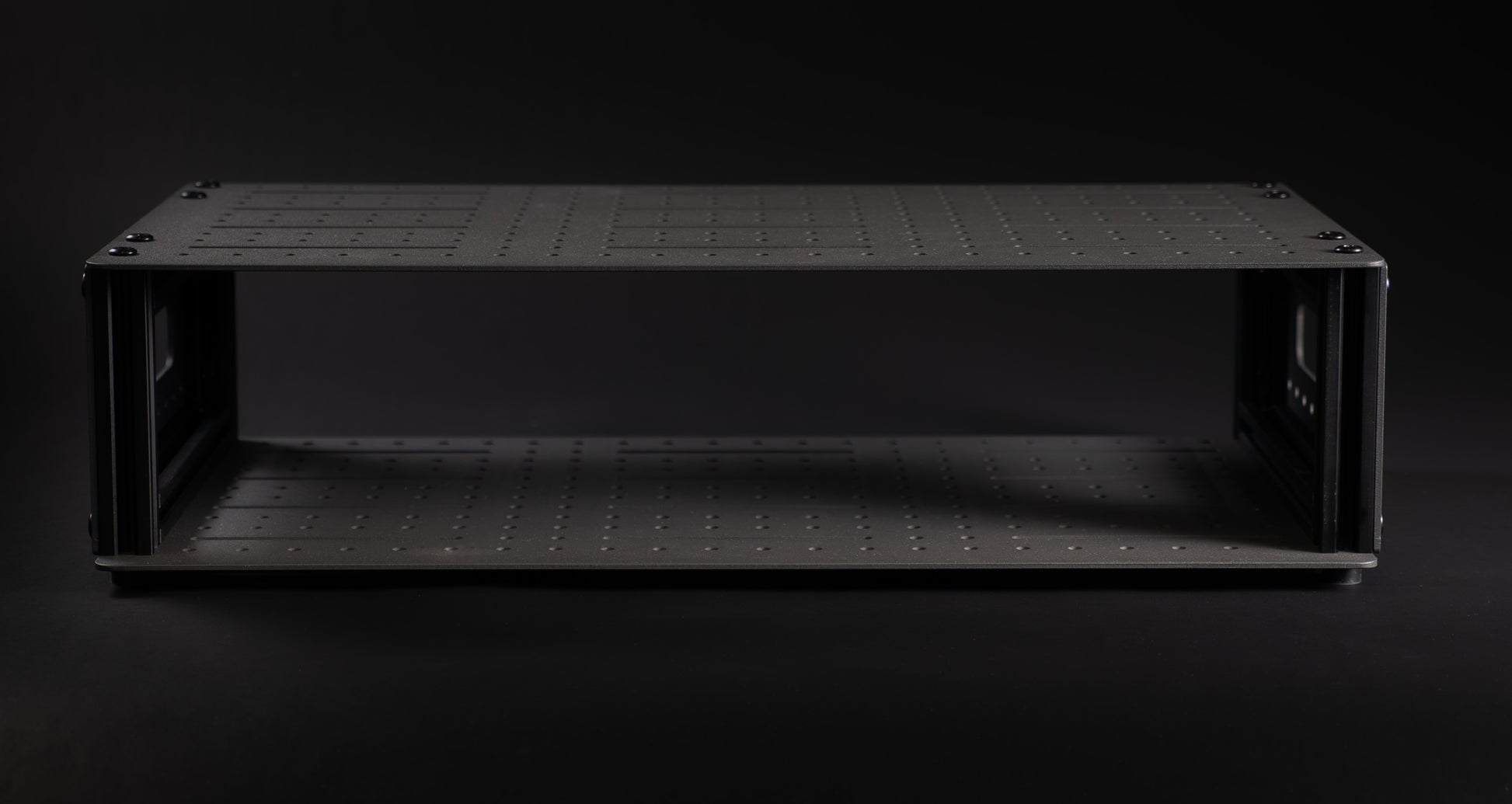 The 20 series compact fly racks are designed for flexibility and customization especially when mounting non rack-standard gear. They are made with 20mm aluminum extrusion frames and textured matte grey powder coated aluminum panels. The gridded panel options have a 20mm spaced grid of M5 mounting points, allowing attachment of gear directly to the rack using solid hardware.