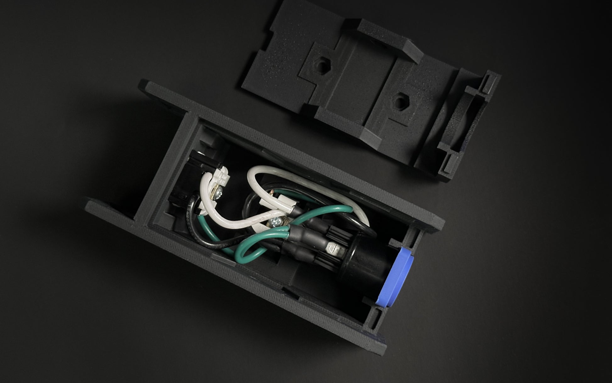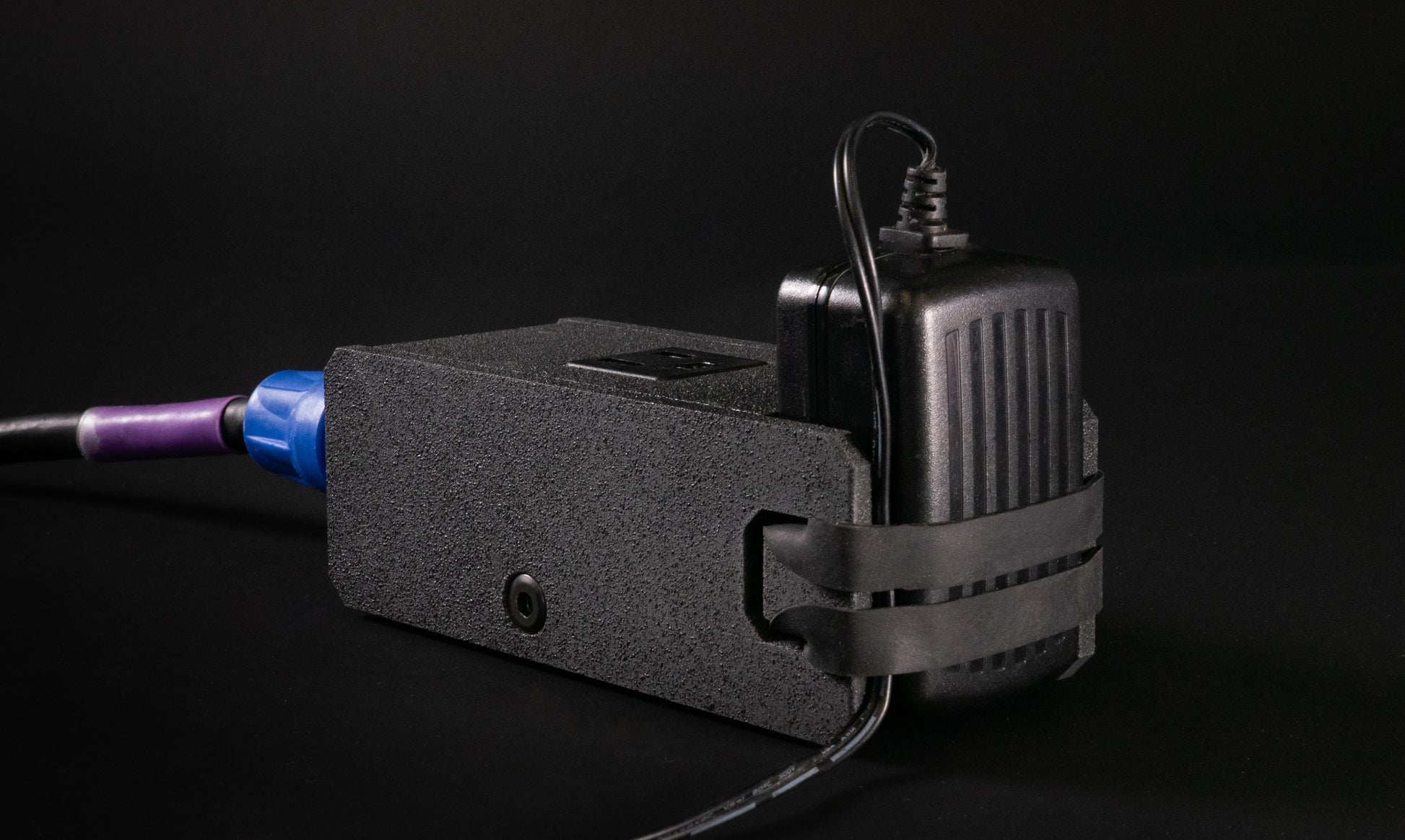 This DIY power enclosure mounts a standard Nuetrik Powercon panel input, and two Edison receptacles, and includes slot and band to hold in place DC power bricks. Useful for small setups where you just need to securely hold a DC adapter with powercon input.